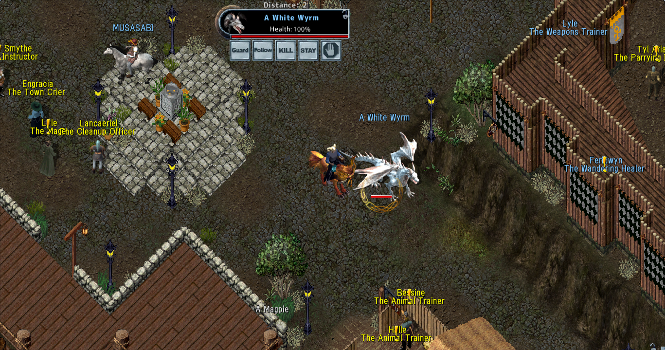 - 死にかけのWhite Wrymに、とどめをさす為にペットがうろつき始めたら、回復は包帯巻きから魔法に切り替えた方が良い。(前述のようにWhite Wyrmは高Mageryなので、逃げながらでも結構魔法を撃ち返してくる。動きまわるので包帯を空振る危険があり、200程度のHPしかない2Slot麒麟にはリスクとなる)